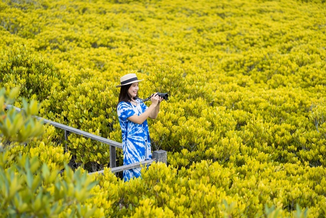 In the mangrove forest in Pak Nam Pra Sae, when the sunlight reflects the trees, the trees' color changes to yellowish green and becomes like a golden meadow for the tourists to take some photos in 360 degrees.