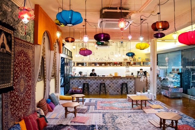 Get into the fairytale and visit Aladdin's Agrabah. A Turkish cafe mixed with Moroccan vibes, decorated with curtains, patterned rugs, arched doors, and bright colored lamps. Serving the Middle Eastern style menu, adjusting the taste to be easy to eat, and decorating photogenic dishes.